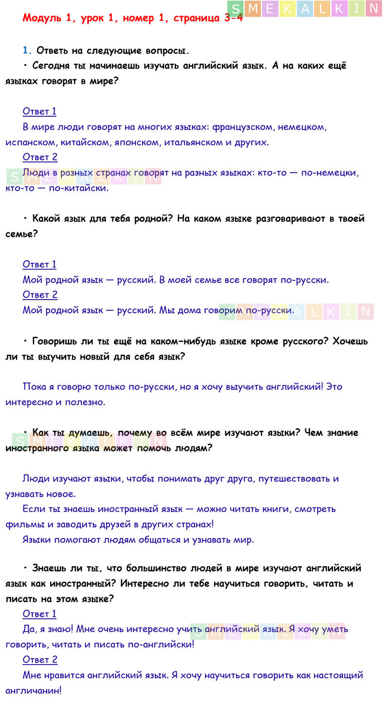 ГДЗ к 1 номеру 1 урока 1 модуля на 3-4 страницах учебника по Английскому языку Афанасьевой, Барановой, Михеевой для 2 класса 1 часть