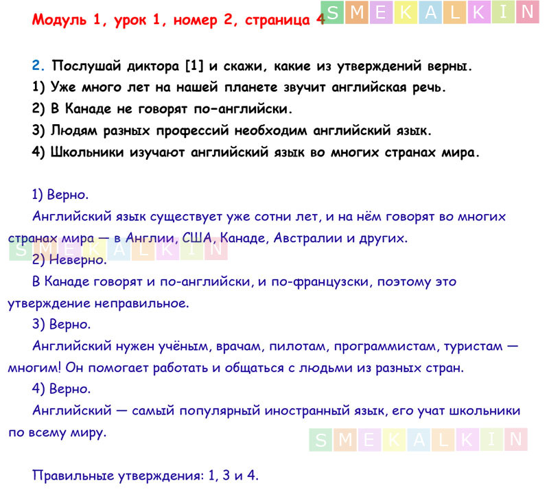ГДЗ ко 2 номеру 1 урока 1 модуля на 4 странице учебника по Английскому языку Афанасьевой, Барановой, Михеевой для 2 класса 1 часть