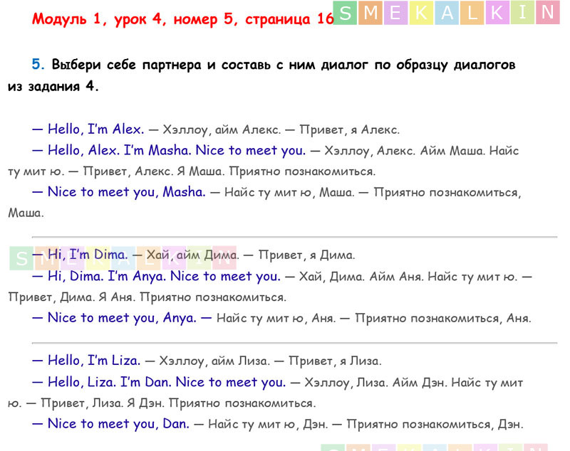 ГДЗ к 5 номеру 4 урока 1 модуля на 16 странице учебника по Английскому языку Афанасьевой, Барановой, Михеевой для 2 класса 1 часть