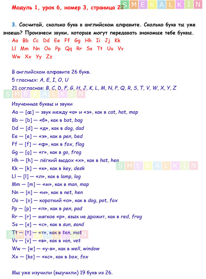 ГДЗ к 3 номеру 6 урока 1 модуля на 22 странице учебника по Английскому языку Афанасьевой, Барановой, Михеевой для 2 класса 1 часть