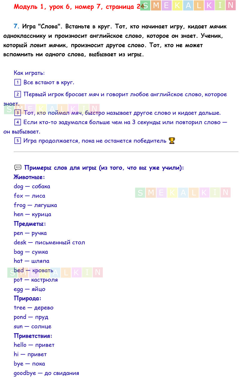 ГДЗ к 7 номеру 6 урока 1 модуля на 24 странице учебника по Английскому языку Афанасьевой, Барановой, Михеевой для 2 класса 1 часть