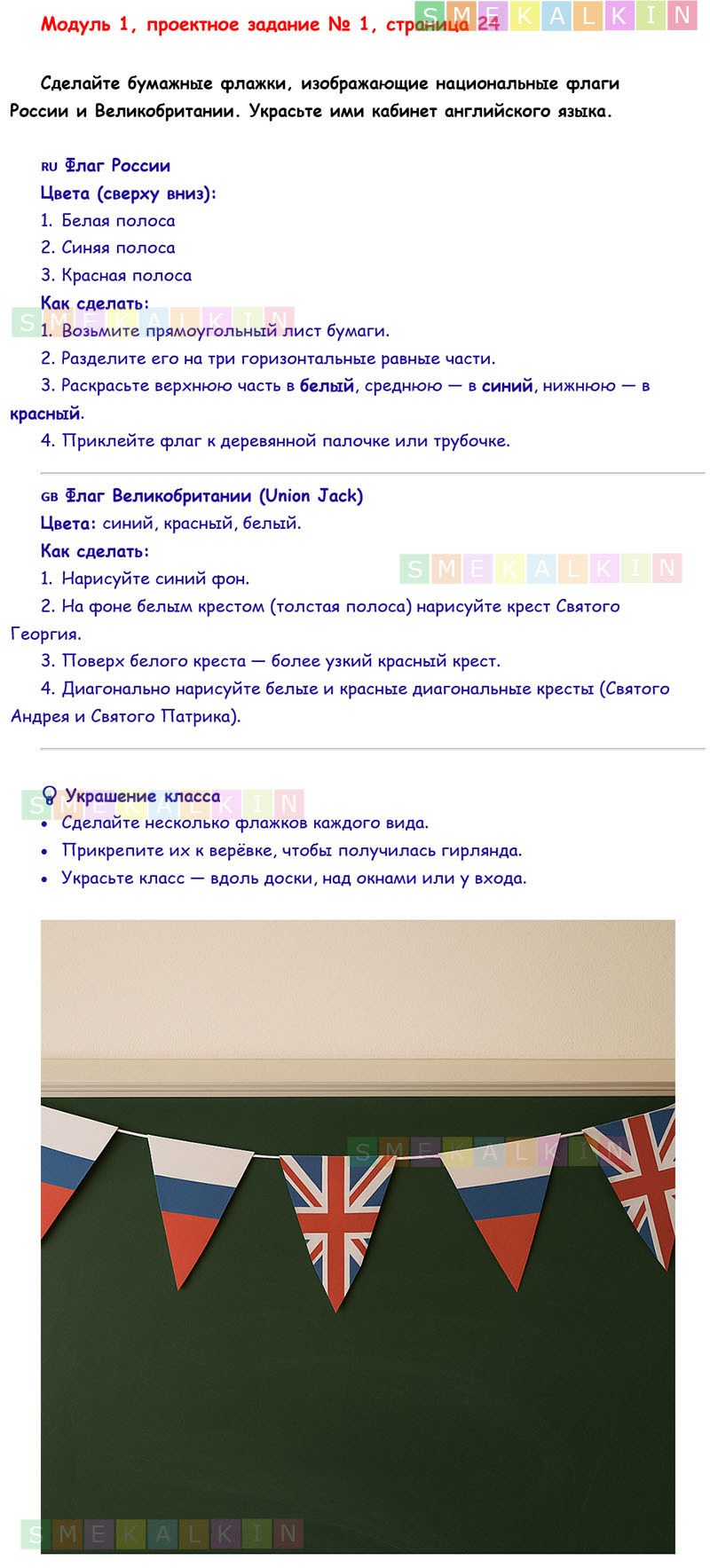 ГДЗ к проектному заданию №1 модуля 1 на 24 странице учебника по Английскому языку Афанасьевой, Барановой, Михеевой для 2 класса 1 часть