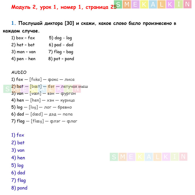 ГДЗ к 1 номеру 1 урока 2 модуля на 25 странице учебника по Английскому языку Афанасьевой, Барановой, Михеевой для 2 класса 1 часть
