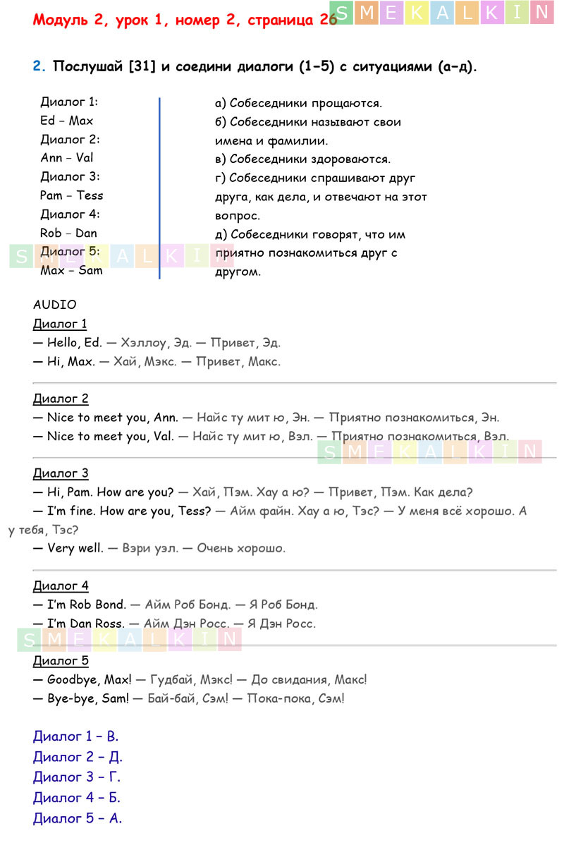 ГДЗ ко 2 номеру 1 урока 2 модуля на 26 странице учебника по Английскому языку Афанасьевой, Барановой, Михеевой для 2 класса 1 часть