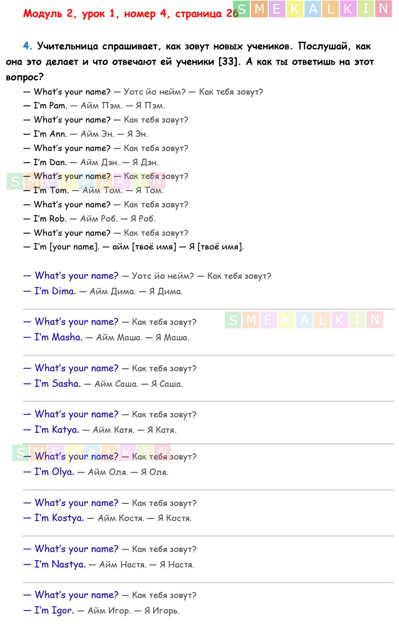 ГДЗ к 4 номеру 1 урока 2 модуля на 26 странице учебника по Английскому языку Афанасьевой, Барановой, Михеевой для 2 класса 1 часть