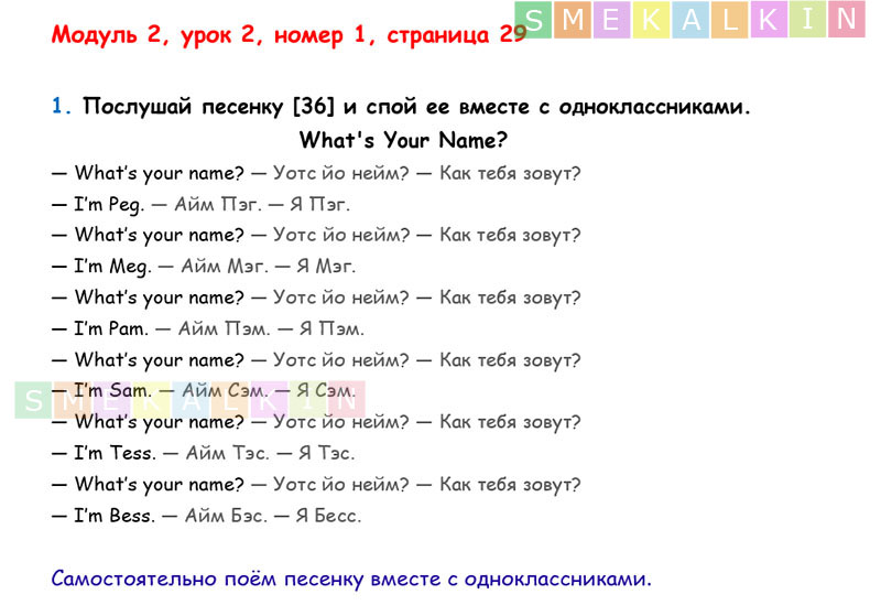 ГДЗ к 1 номеру 2 урока 2 модуля на 29 странице учебника по Английскому языку Афанасьевой, Барановой, Михеевой для 2 класса 1 часть