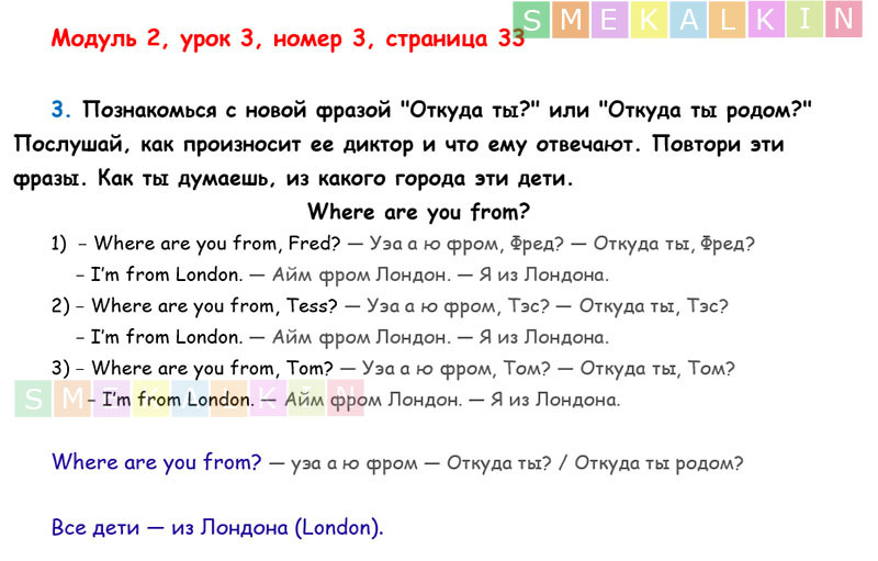 ГДЗ к 3 номеру 3 урока 2 модуля на 33 странице учебника по Английскому языку Афанасьевой, Барановой, Михеевой для 2 класса 1 часть