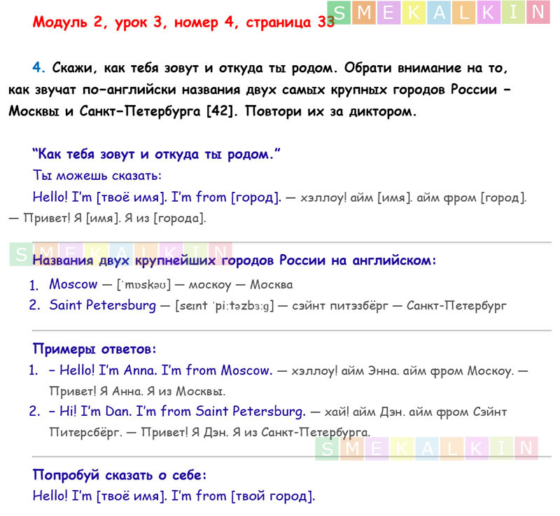 ГДЗ к 4 номеру 3 урока 2 модуля на 33 странице учебника по Английскому языку Афанасьевой, Барановой, Михеевой для 2 класса 1 часть