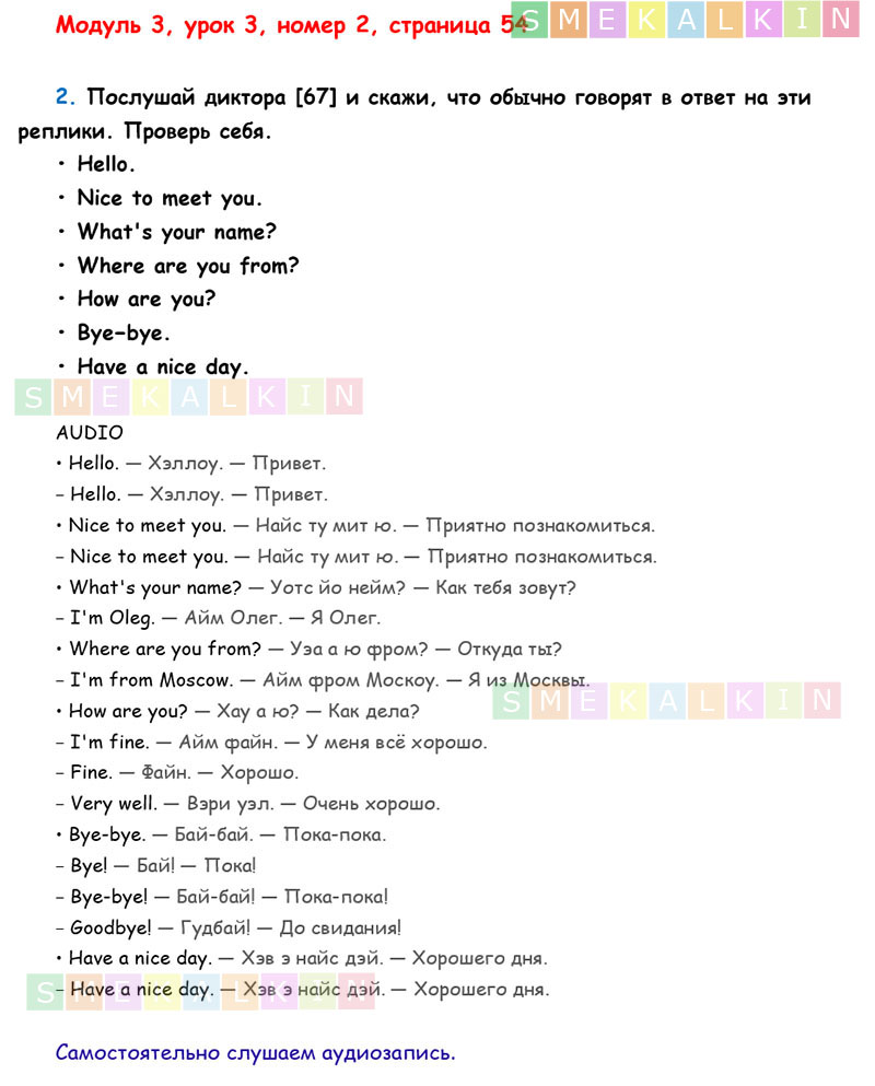 ГДЗ ко 2 номеру 3 урока 3 модуля на 54 странице учебника по Английскому языку Афанасьевой, Барановой, Михеевой для 2 класса 1 часть