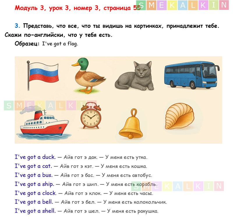 ГДЗ к 3 номеру 3 урока 3 модуля на 55 странице учебника по Английскому языку Афанасьевой, Барановой, Михеевой для 2 класса 1 часть