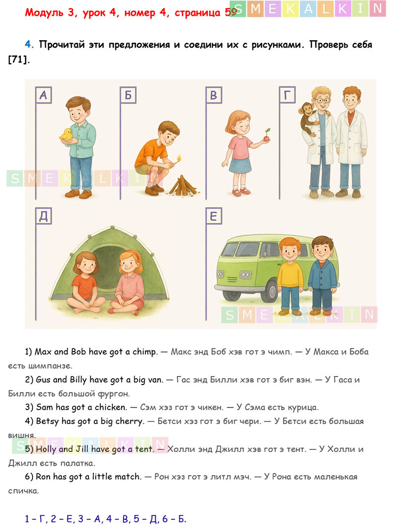 ГДЗ к 4 номеру 4 урока 3 модуля на 59 странице учебника по Английскому языку Афанасьевой, Барановой, Михеевой для 2 класса 1 часть