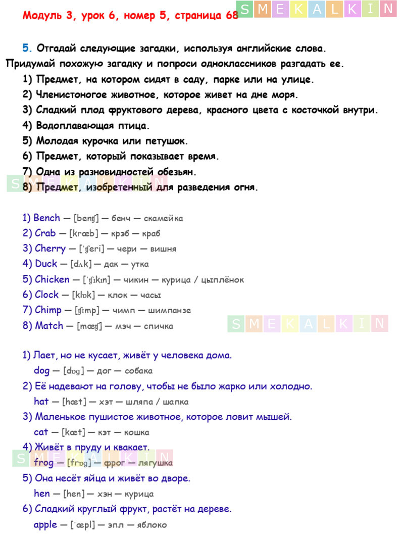 ГДЗ к 5 номеру 6 урока 3 модуля на 68 странице учебника по Английскому языку Афанасьевой, Барановой, Михеевой для 2 класса 1 часть