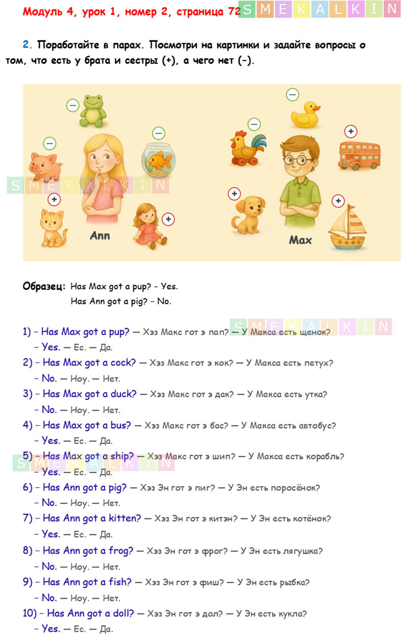 ГДЗ ко 2 номеру 1 урока 4 модуля на 72 странице учебника по Английскому языку Афанасьевой, Барановой, Михеевой для 2 класса 1 часть