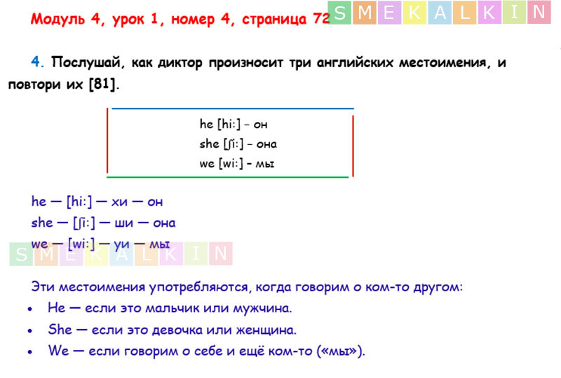 ГДЗ к 4 номеру 1 урока 4 модуля на 72 странице учебника по Английскому языку Афанасьевой, Барановой, Михеевой для 2 класса 1 часть