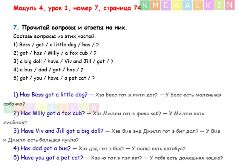 ГДЗ к 7 номеру 1 урока 4 модуля на 74 странице учебника по Английскому языку Афанасьевой, Барановой, Михеевой для 2 класса 1 часть