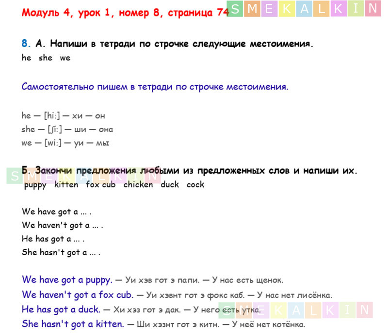 ГДЗ к 8 номеру 1 урока 4 модуля на 74 странице учебника по Английскому языку Афанасьевой, Барановой, Михеевой для 2 класса 1 часть