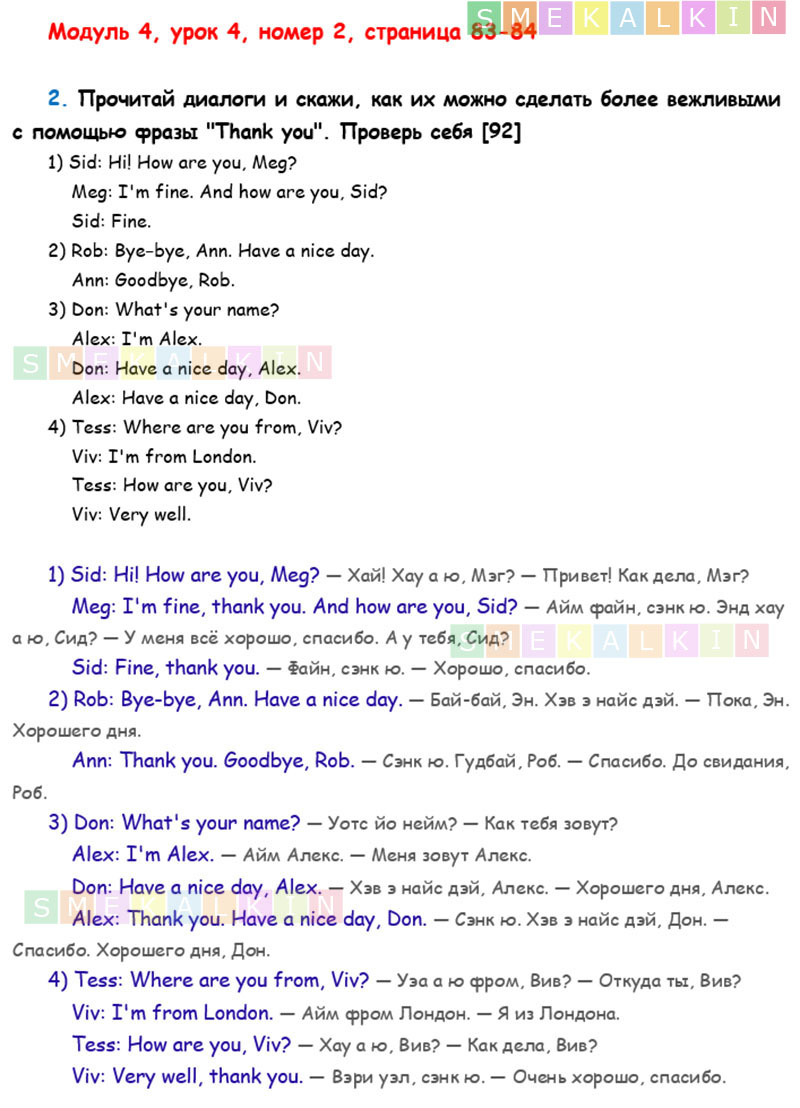 ГДЗ ко 2 номеру 4 урока 4 модуля на 83-84 страницах учебника по Английскому языку Афанасьевой, Барановой, Михеевой для 2 класса 1 часть