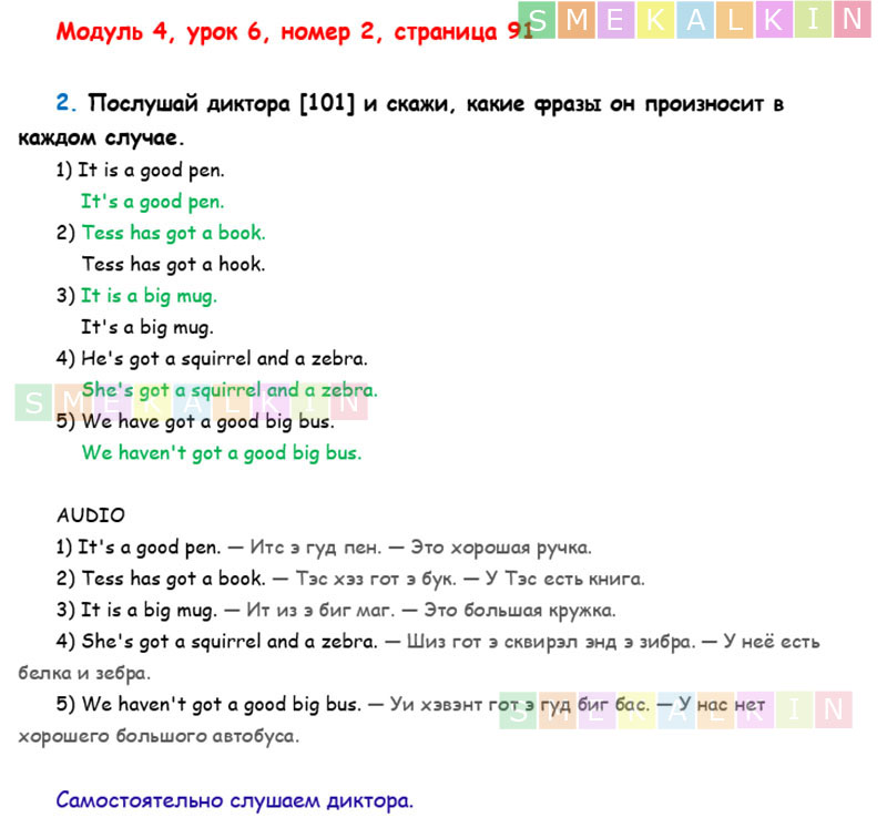 ГДЗ ко 2 номеру 6 урока 4 модуля на 91 странице учебника по Английскому языку Афанасьевой, Барановой, Михеевой для 2 класса 1 часть