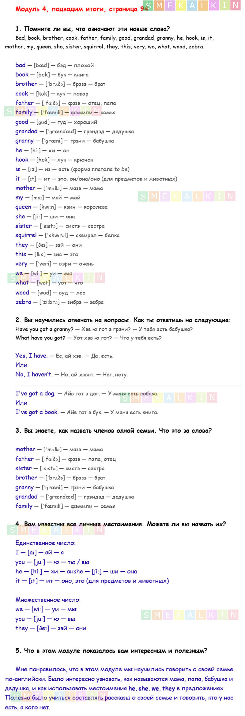 ГДЗ к заданиям «Подводим итоги» модуля 4 на 94 странице учебника по Английскому языку Афанасьевой, Барановой, Михеевой для 2 класса 1 часть