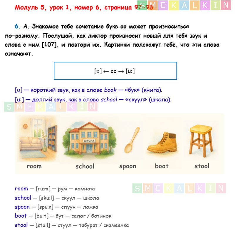 ГДЗ к 6 номеру 1 урока 5 модуля на 97-98 страницах учебника по Английскому языку Афанасьевой, Барановой, Михеевой для 2 класса 1 часть