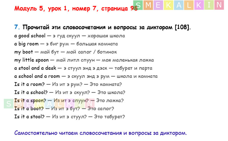 ГДЗ к 7 номеру 1 урока 5 модуля на 98 странице учебника по Английскому языку Афанасьевой, Барановой, Михеевой для 2 класса 1 часть