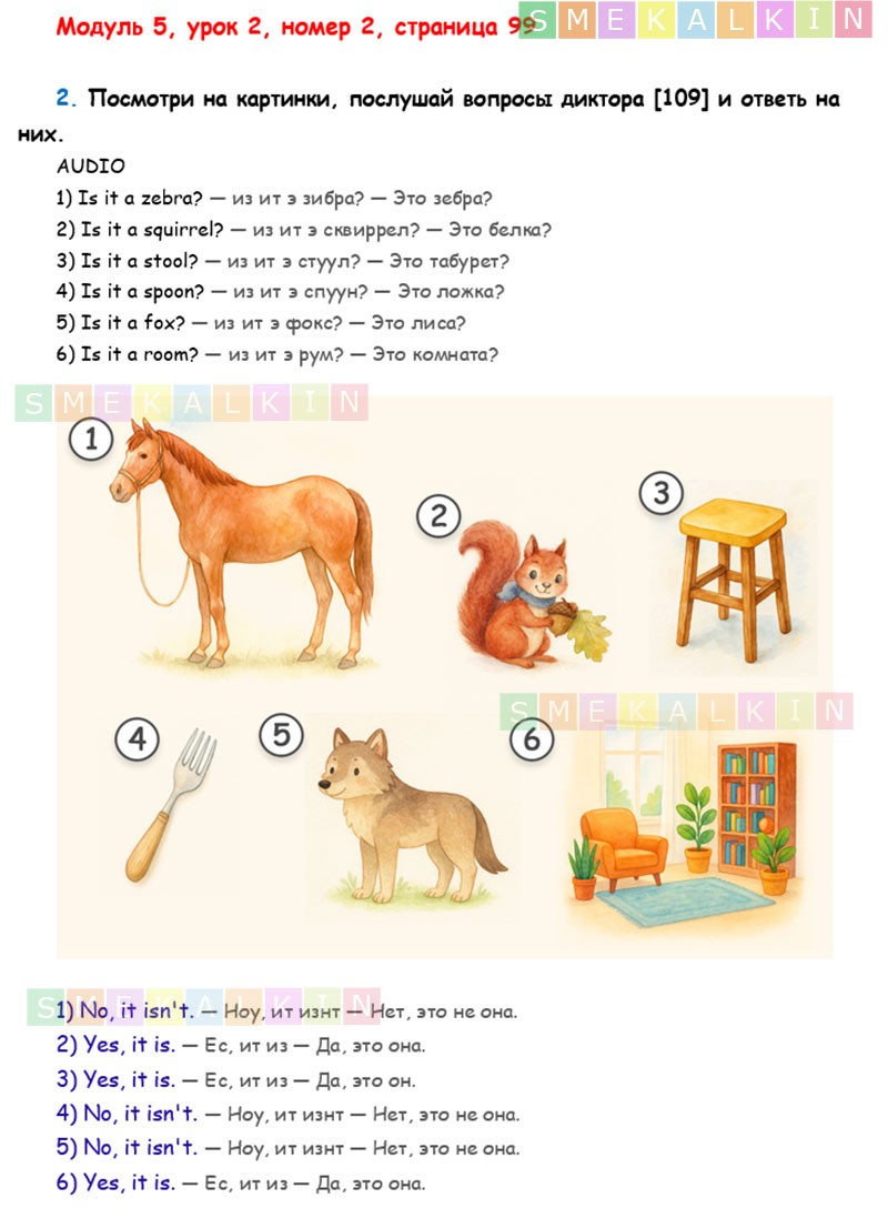 ГДЗ ко 2 номеру 2 урока 5 модуля на 99 странице учебника по Английскому языку Афанасьевой, Барановой, Михеевой для 2 класса 1 часть
