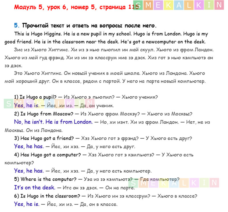 ГДЗ к 5 номеру 6 урока 5 модуля на 115 странице учебника по Английскому языку Афанасьевой, Барановой, Михеевой для 2 класса 1 часть